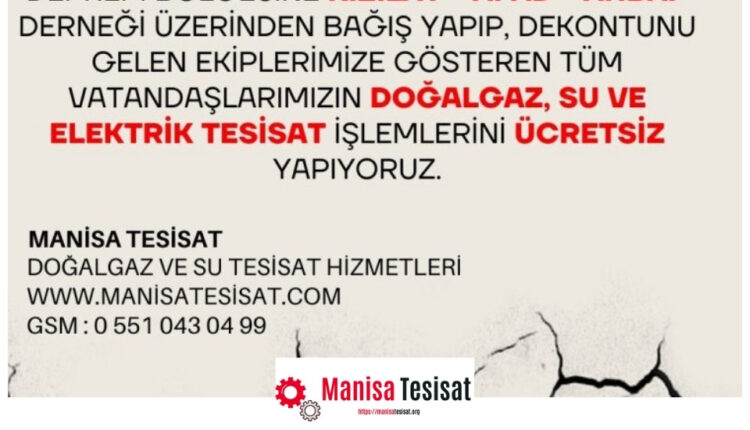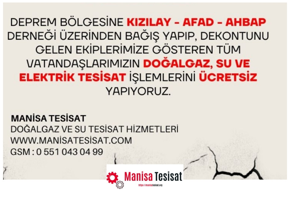 Kampanyamız kapsamında, deprem bölgelerine KIZILAY – AFAD – AHBAP derneklerine yardım bağışı yapacak ve dekontunu gelen ekiplere gösterecek her müşterimize doğalgaz, su ve elektrik tesisat işlemlerini ücretsiz yapacağız.